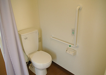 トイレは各部屋にあるので気兼ねもありません。スライド式カーテンなので車イスなどでも入りやすくなっています。